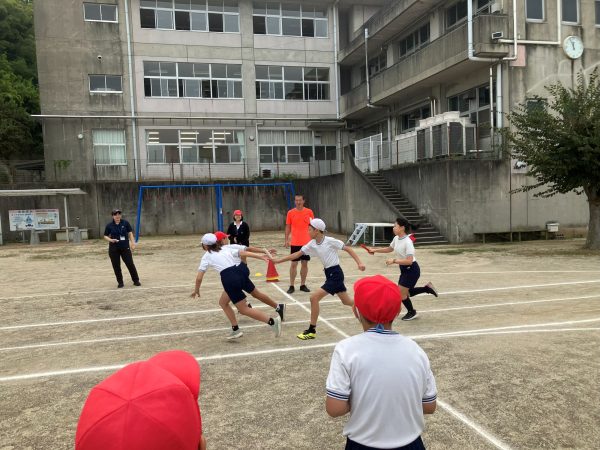 最後は赤・白に別れてリレー対決!教えてもらったことを思い出しながら走る児童たち。