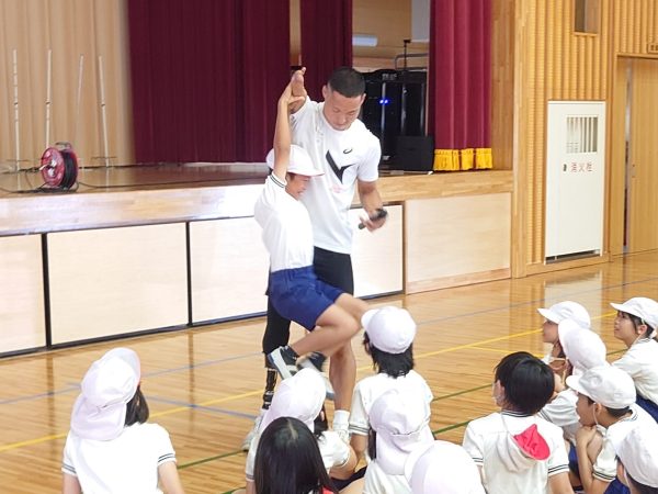 1人の児童を持ち上げてみせると「うぉーっ!?すごーい!」と大きな歓声が上がりました。