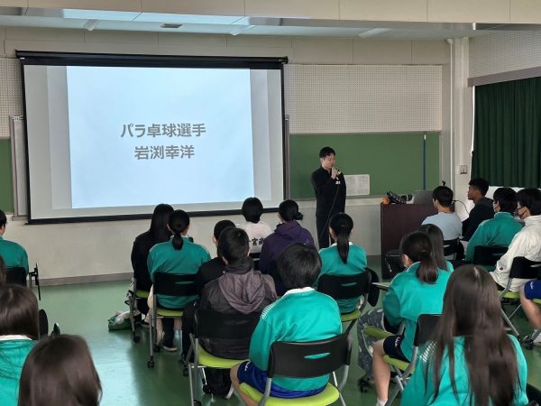 講話では、なかなか聞くことのできないパラスポーツの現状や、周りのサポートがなければ成立できず、人とのつながりの大切さを説明しました。パラリンピック期間の現地での生活や、その時の経験談や、感じたことには生徒たち、教員の方々も興味を示し真剣に静聴していました。
