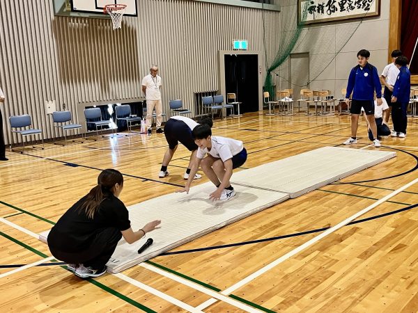 マット運動の基本である前転や後転を分かりやすく指導。生徒たちは楽しみながら挑戦し、技のコツを学びました。