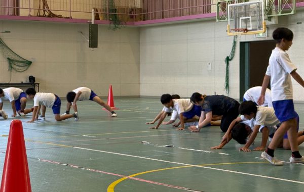 実技が進んでいくと「イモムシの動き」や「スパイダーウォーク」に挑戦。「ムリや!!」との声が聞こえるも児童たちは果敢に挑戦します。