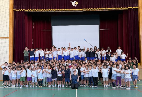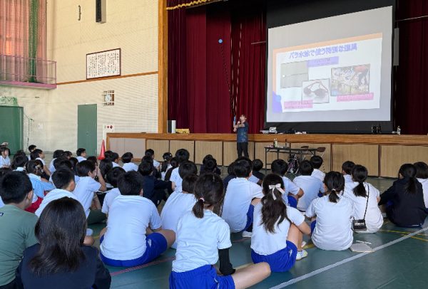 体育館中に響きわたる全校児童の「おはようございます!!」で始まった辻内さんによる特別授業。