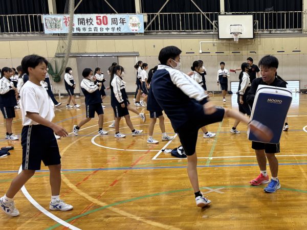 2人1組で組手も行い、様々な技にも挑戦していました。最後はミットを持った原田さんに蹴り!力強い蹴りとともにバチン!バチン!という音が体育館中に響いていました。1時間みっちり指導してくれた成果が見られた瞬間でした。