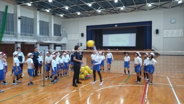 実技では、ストレッチやアジリティーの練習、2人1組でのボール取りなど、ユニークな練習で児童たちも大はしゃぎ!グループになってのオーバーハンドパスやアンダーハンドパスの練習後、最後に全員でスパイクを打ちました。