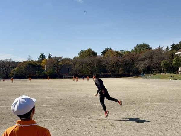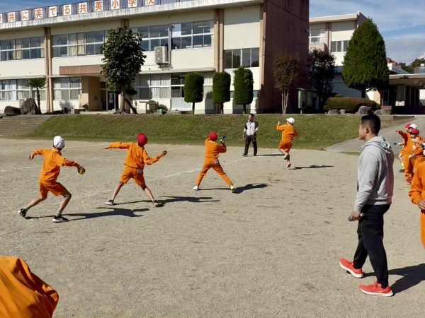 後半は6年生がグラウンドに出て実技の授業です。若生さんから投げ方のコツを教わり、どんどん投げていく児童たち。遠投の練習ではみんな遠くまで投げることができました。