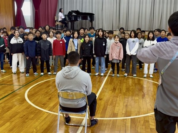 お話をしてくださった若生さんに児童たちから歌のプレゼント!お返しに歌ってくれた4・5年生のみなさんへサイン入り色紙が若生さんからプレゼントされました。