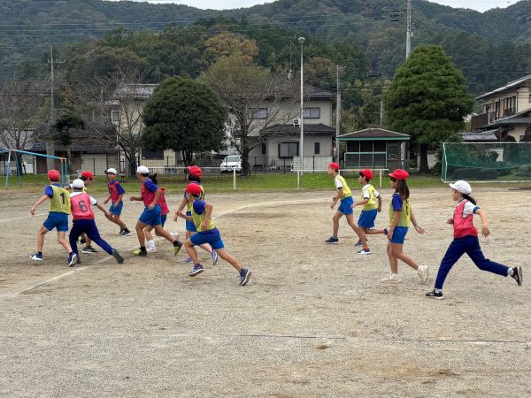 その後何種目か行い、試合に入る前に円になってパス練習。約40メートル先のコーンを目指し進んでいきます。うまくいくコツとして、優しいパス、コミュニケーションをしっかりとること。先生も参加し最後は勝負へ!白熱の勝負になりました!