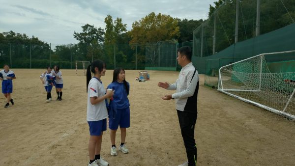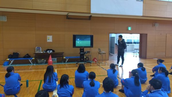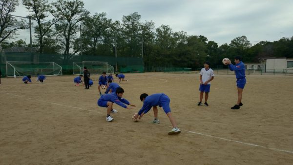 グラウンドへ移動し実技へ。ボールを使った反射神経の練習、基本的なボールを蹴り方を教わりパス練習。慣れてきたところで4人組になり、三角形を作り、一人がボールを取る練習。その後は男子、女子に分かれ、ゲームをしました!女子生徒が大盛り上がり!キャーキャー言いながら一生懸命ボールを追っていました。