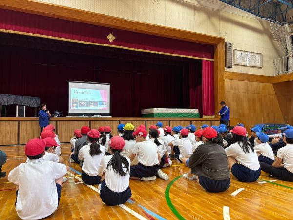畠田さんの自己紹介と、体操競技の説明から始まりました。体操をしている児童は憧れと尊敬の眼差しで、他の児童たちも集中して講話を聞いていました。
