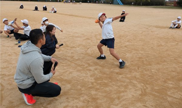 遠くに投げるのが得意な児童たちが前に出て、コツや意識しているポイントを他の仲間に伝える場面も。