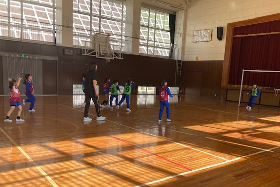 その後は実技へ。ボールを使ったビンゴゲームやシュート練習でウォームアップを行い、最後はチームに分かれてハンドボールの試合を実施。ハンドボールを知らない児童は初め不安そうな顔をしていましたが、練習や試合を重ねるうちに笑顔が増え、最後は「楽しかった!」という表情に。