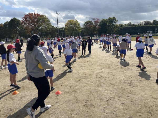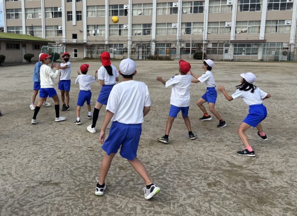 後半では、パスゲームで児童全員が全力で楕円球を追いかけます。