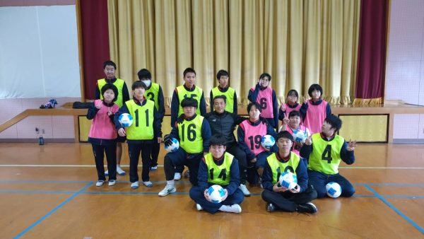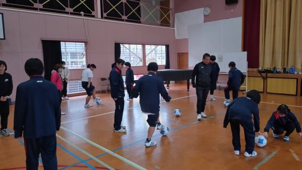 実技では、ボールタッチ、蹴り方、パスの練習を行い、ゲームへ。女子対先生チーム、男子対先生チームと2試合行いました。結果は、中払さん率いる先生チームの勝利。それでもみんな一つのボールを追い、一生懸命取り組んでいました。