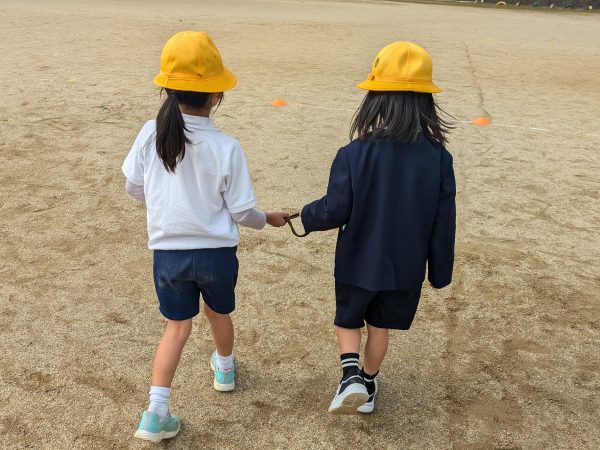 運動場ではアイマスクをつけた児童と、ガイド役の児童が2人1組になって「きずな」と呼ばれるロープを握り走行体験。
