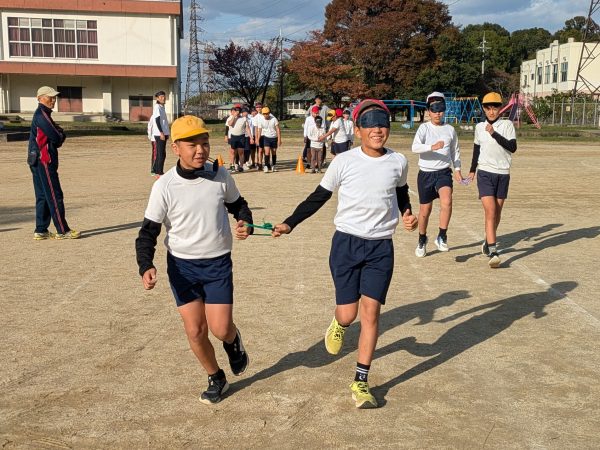 運動場ではアイマスクをつけた児童と、ガイド役の児童が「きずな」と呼ばれるロープを握り合いながら走行体験。