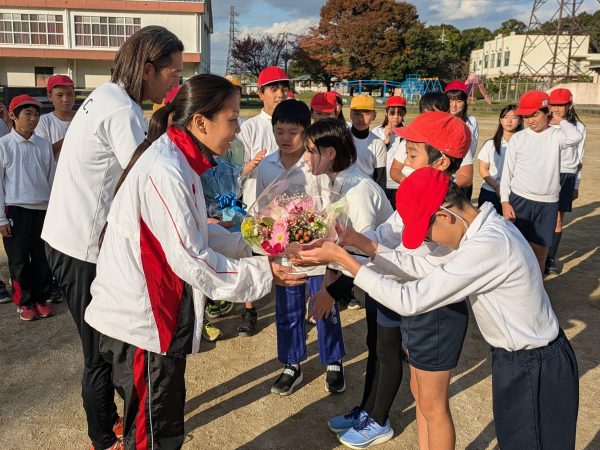 授業の最後には、児童たちからお2人へ花束のサプライズプレゼント。
