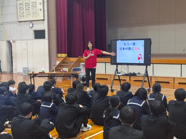 講話では、運動が苦手ながらソフトボールと出会い、大きな夢を抱く。