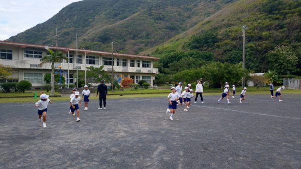 学校へ到着した際に、学校の外周を走っていた児童たち。持久走大会に向けて試走を行っていました。今回は13名が参加!