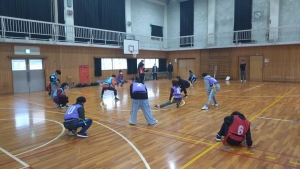まずはアップ。タグ鬼ごっこ。決められたビブスを来たチームが全員のタグを取りに行く。何試合か行い、温まったところで先生チームが鬼に。