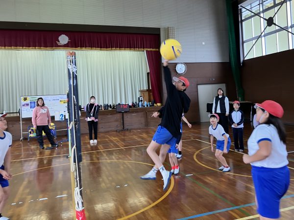 最後は試合形式のゲームです。各チームのリーダーが試合に臨む目標を語り、ゲーム後に振り返ります。1年生から6年生までが混ざったチームですが、声を出し合い励まし合い、協力しあいやり遂げました。児童たちも大満足。