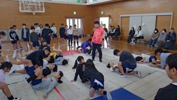 実技では、レスリングの基礎から学びます。身体の動かし方、構え。俊敏に動く練習。2人1組での肩タッチゲームに押し相撲!負けた方は罰ゲーム。ジャンプスクワットや腕立て伏せに腹筋に腿上げ。負けてしまった児童たちも本当に楽しそうです!そして受け身の練習をした後にはタックル!