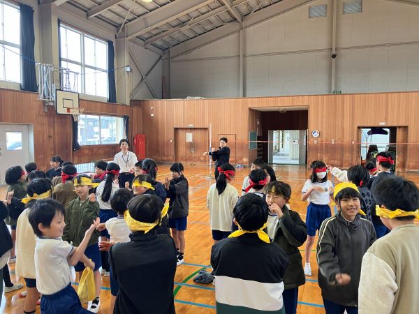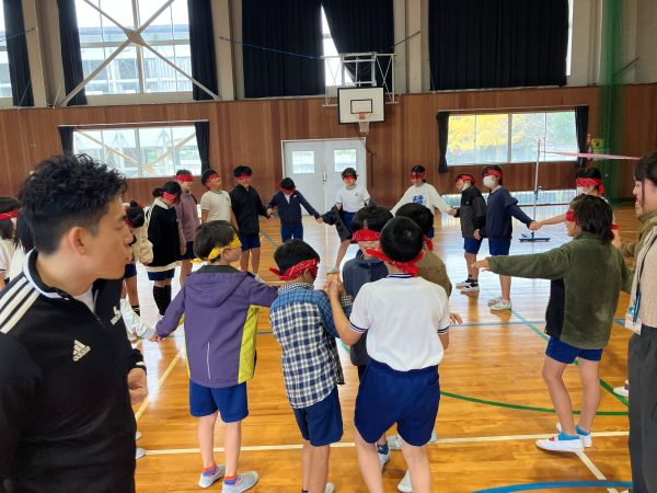 実技ではバンダナで目隠しをして、山口さんの動きを相手に言葉で伝えて同じ動きをしてもらったり、目隠しをしたままクラス毎に大きな円を作ったりしました。