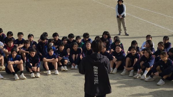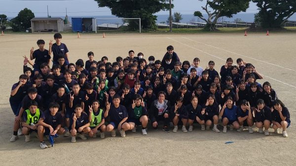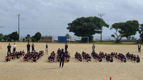 学校から太平洋を一望。校長室から見える海では、クジラの潮吹きやバックフリップが見えることもあるそう!学校の屋根にはシーサー。沖永良部島が琉球王朝の島だったことを示す名残です。強い日差しで汗ばむ気温の中、岩本さんが全校の前に登場!軽く自己紹介を行い、早速実技に入ります。