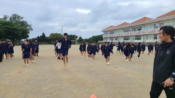 学校から太平洋を一望。校長室から見える海では、クジラの潮吹きやバックフリップが見えることもあるそう!学校の屋根にはシーサー。沖永良部島が琉球王朝の島だったことを示す名残です。強い日差しで汗ばむ気温の中、岩本さんが全校の前に登場!軽く自己紹介を行い、早速実技に入ります。