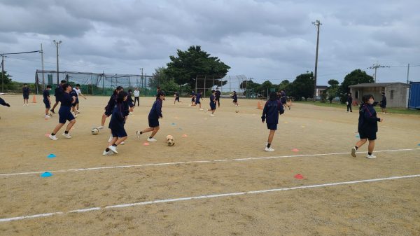 たくさんボールにさわったところで試合です。男子も女子も真剣にプレー。歓声や悲鳴がグラウンドに響き渡り、楽しいサッカー実技は、あっという間に2コマが終わりました。