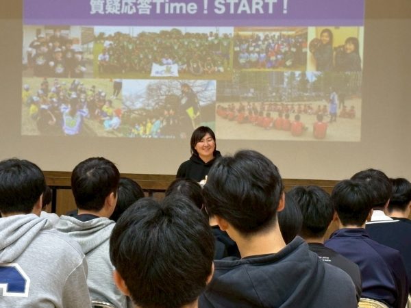 1年生から3年生までのスポーツ専攻の生徒たちに「素直に人に聞ける人は、他人に助けてもらえる人」、「ワクワクする事で結果が変わる」という事を、講話の中のワークを通して実感してもらいました。講話の最後は「個性を大事にしてほしい」と締めくくりました。