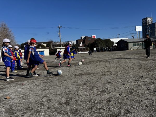 投げたり、蹴ったりボールになれていきます。最後はラグビーボールを使ったリレーで対決!