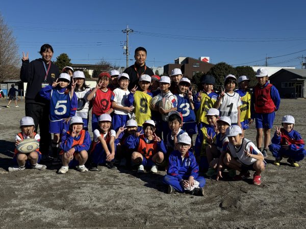 次はチームに分かれパス練習。初めてラグビーボールに触れる児童たち。落とすといろんな方向にバウンドしてしまい大苦戦!それでも必死に食らいつく児童たち。