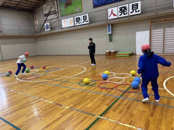 フラフープの枠にいち早くチームの色のボールを3つ並べたら勝ちになるこのゲームは、足の速さやといった身体能力に加えて、状況を把握して判断する思考力や次のチームメイトの為にはどうすればいいかも考える必要があるゲームです。