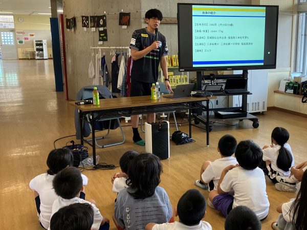 始めに教室で映像を交えての自己紹介がありました。国際試合やJリーグでのゴールシーンに歓声があがります。