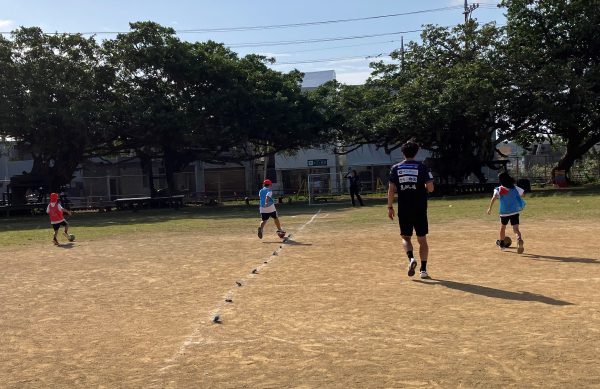 ドリブルリレーでも一所懸命慣れないサッカーボールと格闘し、最後は試合に。