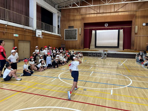 実際に野球選手がやっている体幹トレーニングにチャレンジし、そのあとチームに分かれてのキャッチボール競争、リード&バックの練習、そして五十嵐さんの投球デモンストレーションに児童たちから大きな歓声があがります。