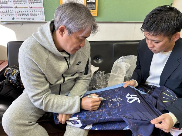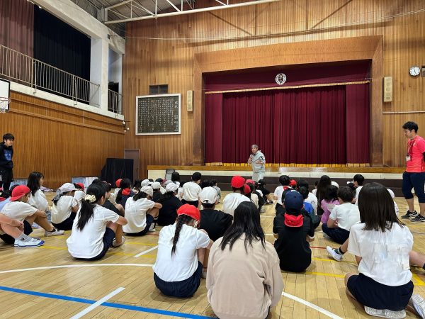 講話の最後にサイン入りユニホーム争奪じゃんけん大会を行ったので、児童たちのテンションが上がってしまいました。