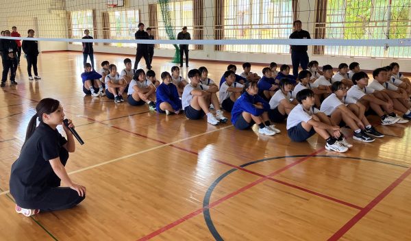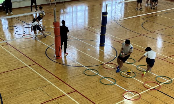 授業終了後は、高学年の小学生も合流し部活動もおこなわれました。レシーブ練習では何度も何度も佐藤さんがスパイクを放ち、先生も含めくらいついてレシーブ。熱のこもった濃密な時間はあっという間に過ぎていきました。