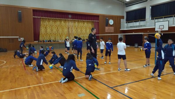 実技では、まず2人1組になり瞬発力を養うゲーム。真ん中にボールを置き、山村さんの言った場所に手を置く。「ボール!」と言った時にボールを素早く奪うというもの。慣れてきた頃に筋肉の名称を言う山村さん。「上腕二頭筋!」や「大腿四頭筋!」など、どこか解らず児童たちも大笑い!グループになりリレーを行ったり、トスやレシーブの練習、最後にスパイクと、児童たちにとってはとても楽しい2時間となりました!