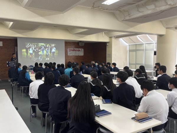 講話の時間は、全校生徒の皆さんと多様性と挑戦することの意味を考えてもらいました。池田さんが先天的なハンディキャップを持って生まれたことを含めて自己紹介することと、今“出来る事”と“出来ないこと”を説明することで、生徒の皆さんが今まで考えたことのない視点で授業を進めました。