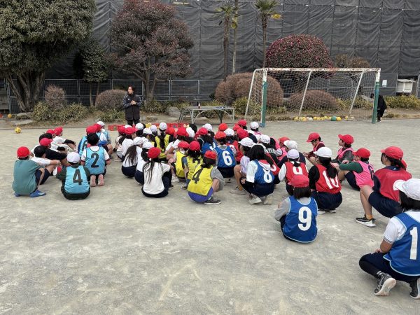 授業最後は講話。岩本さんは各年代の子供たちに指導していく中で、高いレベルまで行く選手はみんな継続してコツコツ続けている。夢、目標を達成するために何が必要かを考え継続している。そして何事にも前向きにチャレンジしているといいます。今回の児童たちにも夢や目標がある子は、それに向かって必要なことを継続していくこと。まだ見つかってない子は何事にもチャレンジしてみてくださいとメッセージを送って授業は終了しました。児童たちからはまだやりたい!時間足りないよと終わりを惜しむ声がたくさん聞こえてきました。