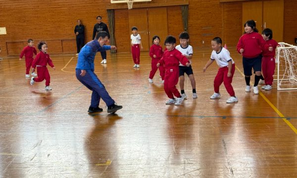 フットサルでボールを扱う動作や身体の使い方の基本を実践した後は村上さんとフットサルの試合です!誰一人弱音を吐かずに懸命に村上さんに食らいつき、村上さんから勝ちをもぎ取ると、教頭先生と校長先生が村上さんの応援のため参戦。