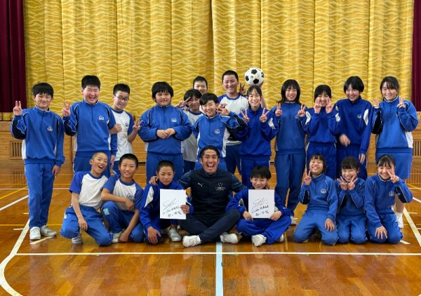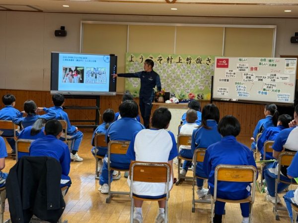 そんな中で村上さんが伝えたのは「仲間の大切さ」。ケガでフットサルワールドカップ出場を断念しそうなときに支えてくれた仲間、また日本代表として切磋琢磨した仲間。自分が諦めそうなとき辛いとき多くの仲間や友達を大事することで夢を叶える可能性は高くなります。今ある日常と友達、家族を大切にして夢に向かって進み続けてほしいと児童たちへ語りました。