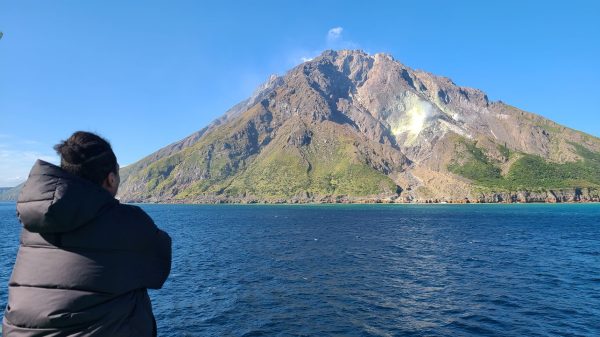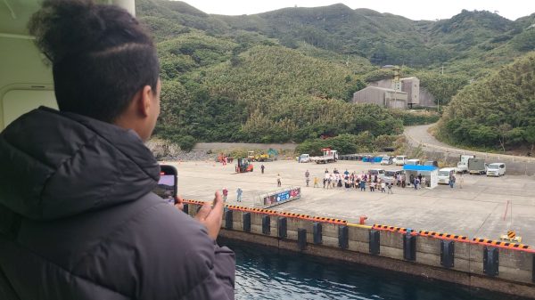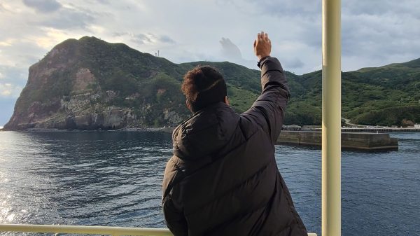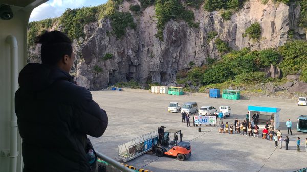 鹿児島港を朝出発。フェリーは三島村を構成する3つの島、竹島、硫黄島を通過し黒島に向かいます。途中、硫黄島の絶景には岡澤さんも時を忘れて見入ります。