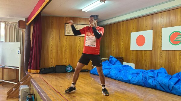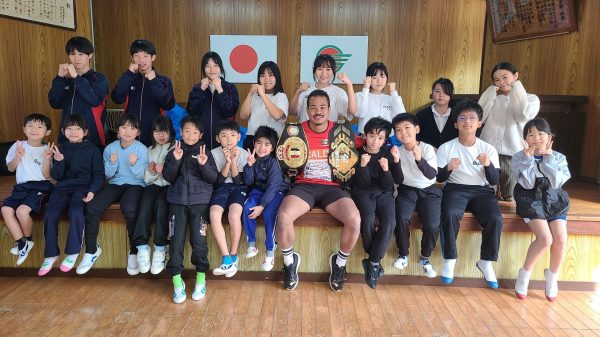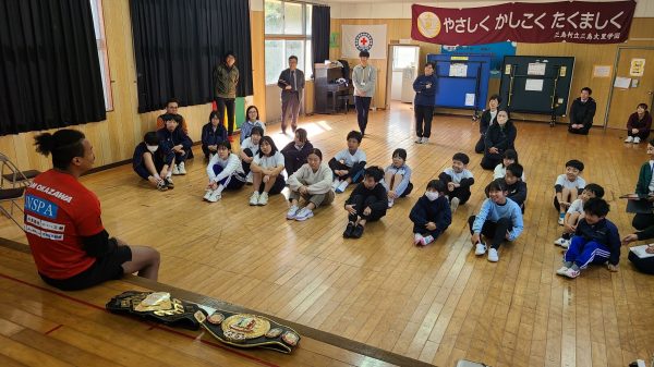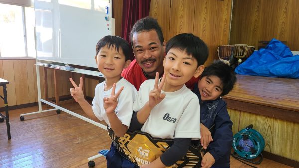 翌朝。小学1年生から中学3年生まで、総勢20名の児童生徒たちが待ちに待った授業。2つのチャンピオンベルトをもって岡澤さんが入場すると、どよめく大里の子供たち。まず自己紹介です。ご自身の名前が本当はとても長いエピソード(岡澤セオンレッツクインシーメンサ)で、子供たち大爆笑。いきなり子供たちの心を掴みます。そしてプロボクシングとボクシング競技(アマ)の違いを説明。先生方からも、へぇー、そうなんだ、という声が漏れます。