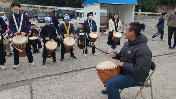ここで急きょフェリーを降りた岡澤さん。前日に片泊学園で教わったジャンベ演奏を児童生徒とコラボして別れを惜しみます。
