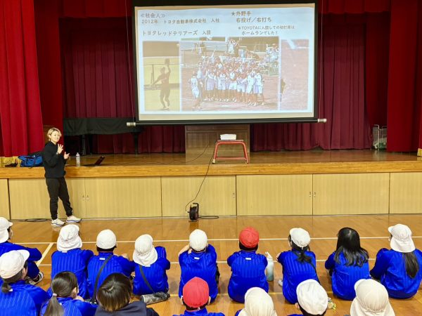 講話の時間では、神山さんの経験を聞きながらソフトボールのことを学びます。体感速度170km/hにもなるというピッチャーの投球映像を見て児童たちはビックリ!「今日はバッティングで試合形式をやるので、時間いっぱい頑張ろう!」神山さんの号令で実技の時間がスタートしました!