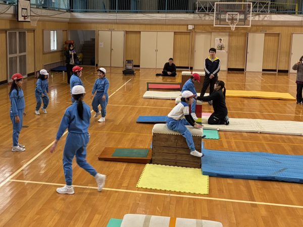 跳び箱が苦手な児童にも「大丈夫!出来るよ!」と、ポジティブな声をかけて最後には見事に着地!周りからも歓声が上がりました!