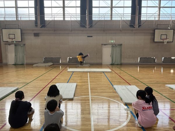 最後は宮川さんが宙返りを披露!大歓声に包まれ授業を終えました!短い時間でしたが、宮川さんの夢に向かっていく大切さ、体操を少しでも好きになってほしいという思いは児童たちにリーチしていました。
