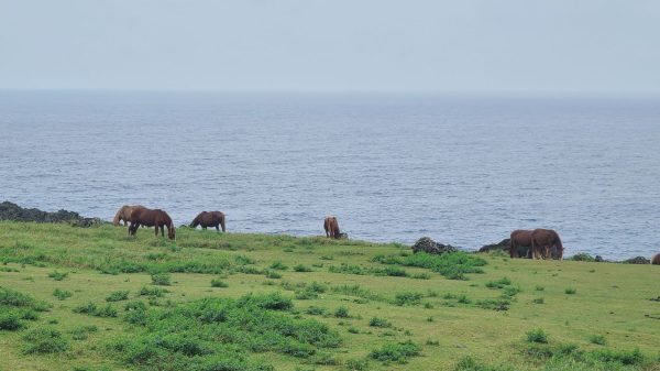 島一周道路は牧場を横切る形になっており、道路から間近に馬を見ることができます。